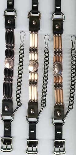 3 strand bootstraps beaded with conchos and chain clips. Genuine leather, cow bone or, buffalo horn beads and our conchos made in the USA. We only use the highest quality genuine leather with authentic Buffalo or, Indian head nickels and our unique collection of conchos. Each bootstrap is multi holed with a buckle making it adjustable and has a chain for a secure fit.