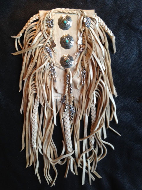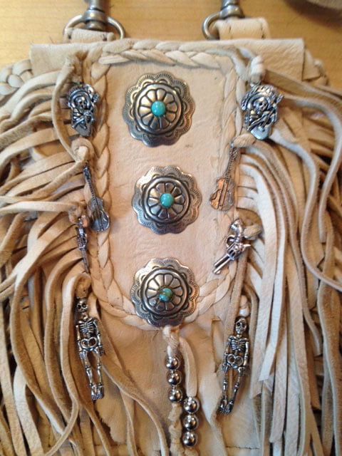 Busy Signal cell phone case bag custom hand crafted from durable soft deerskin, Southwestern conchos with turquoise, classic braids and fringe.