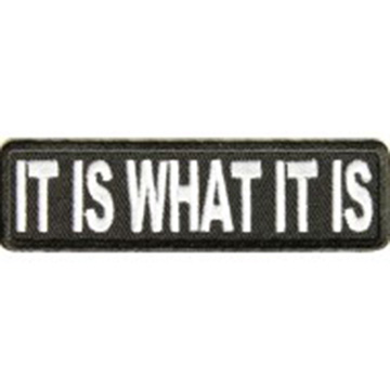 It Is What It Is – Embroidered Funny Tab patch with heat sealed backing for easy application or, can be sewn on for a more durable application and perfect for shirts, jackets and vests. Available in one size 3 1/2″ x 1″ for $4.95.