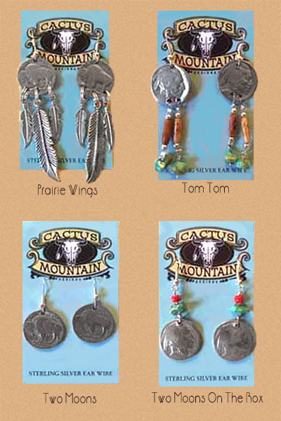 Special Nickel Concho Earrings – Special authentic buffalo and Indian head nickel concho earrings, some with bone or, horn pipe beads and gemstones all with sterling silver ear wires.